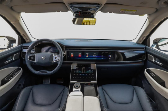 内饰方面:极狐阿尔法T采用环抱式座舱,坐进车内会有一种温馨感。在用料方面也比较厚道,中控台、门内侧饰板都是采用真皮材质进行包裹,触感很柔软,营造出豪华车的氛围感。三幅多功能方向盘的尺寸大小刚好合适,两幅设计是新能源车型惯用的设计手法,相对于三幅方向盘来说,抓握的姿势更多了,两侧的多功能按键采用“虚实结合“,物理旋钮配合触摸按键操作简单又增加了新鲜感。